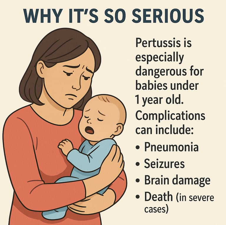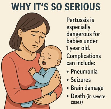 Pertussis is especially dangerous for babies under 1 year old because their immune systems are still developing, and they haven’t yet completed their full vaccination series. For these little ones, a bout of whooping cough can quickly turn severe and lead to serious complications. Some of the most concerning issues include: