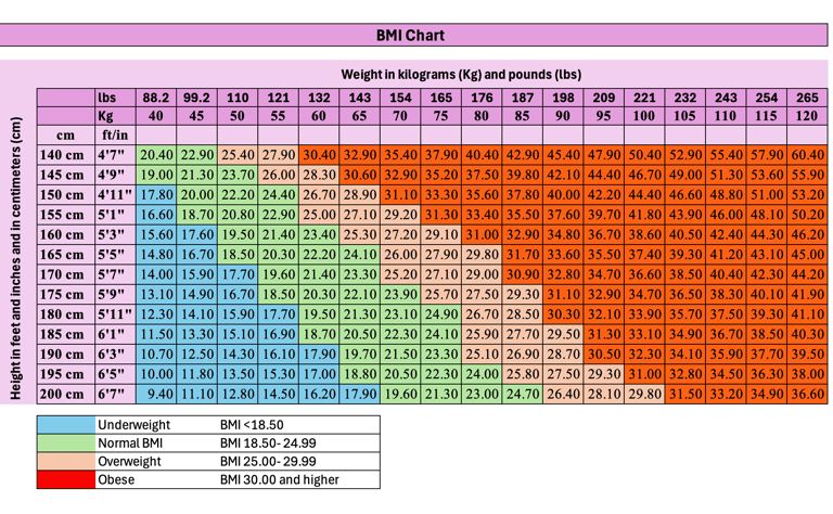 Normal weight: 18.5–24.9 (22.9 for Asians) – Generally associated with lower risks, though lifestyle factors still matter.